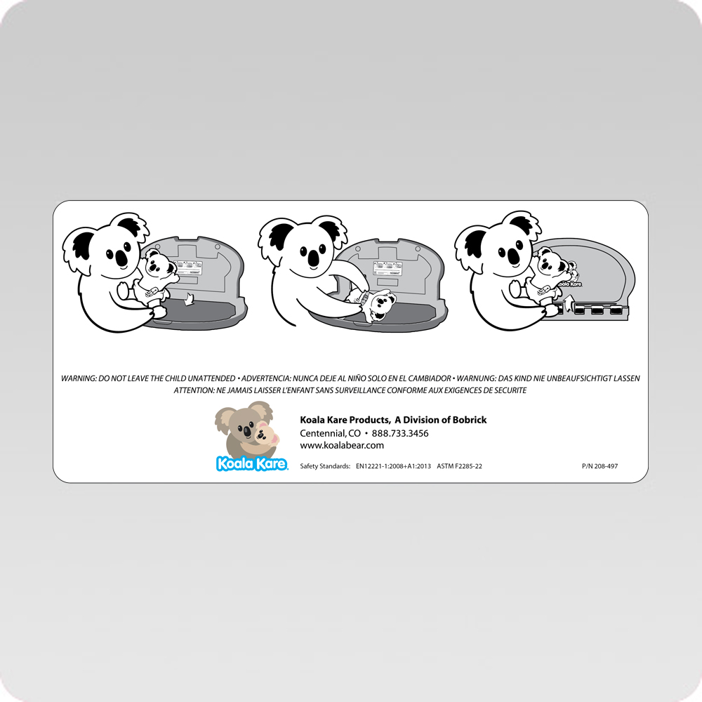 Instructional label adheres to the inside wall portion of the baby changing station. Label includes Koala contact information.